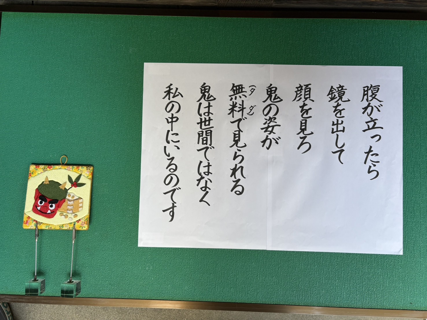 2月3日は節分ですが、それに因んで2月の掲示板は、鬼をテーマにしました。私たち浄土真宗では、鬼は外では無く、内にあるものと聞かせて頂きます。これは、親鸞聖人が、私たちの心の有り様を深く見つめられたからです。その有り様とは、具体的には、三毒の煩悩(貪欲、瞋恚、愚痴)となります。この中で腹が立つということは、瞋恚(しんに)に当たります。