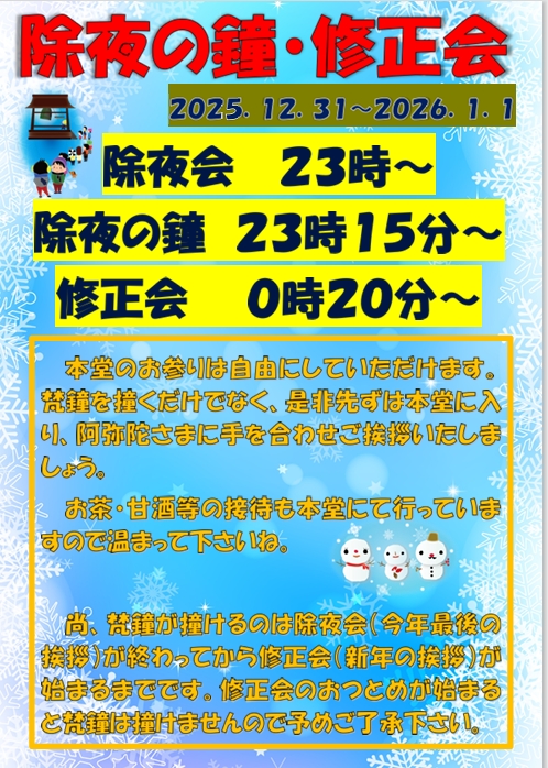 お知らせ 2025/12/05 除夜会・除夜の鐘・修正会’25のご案内 今年もの残り1カ月を切りました。急に冷え込みましたが皆様お変わりございませんでしょうか。今年は 23時より除夜会(今年最後のご挨拶)をつとめ、 23時15分より除夜の鐘を撞き、 0時20分より修正会(新年のご挨拶)となっております。 今年無事に過ごせたこと、新年を迎えられることの感謝のお参りをしませんか?どうぞ暖かい服装でお越しくださいませ。