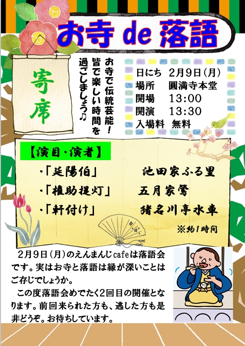 お知らせ 2026/01/25 えんまんじcafe26’2月~落語会~のご案内 第2回えんまんじcafe落語会のご案内です。 2月9日(月) 開場 13時 開演 13時半 約1時間で、3名の方がご登壇予定です。演者さんが高座に上がられたら静かにしていただきつつも、面白いところではしっかり笑ってみんなで寒さも吹き飛ばして楽しみましょう(^^♪ ※本堂は入るのに階段がありますが、本堂内は椅子式です。