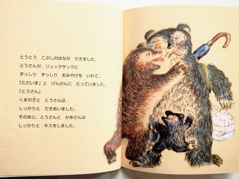 くまのお父さんはなかなか一緒にいられないかもしれないけど、くまの子にしっかりと寄り添っています。例え時間は短くとも、くまの子を想う気持ちは伝わるんですね。きっとお母さんもお父さんを尊敬しているから、それもくまの子は感じているのでしょう。