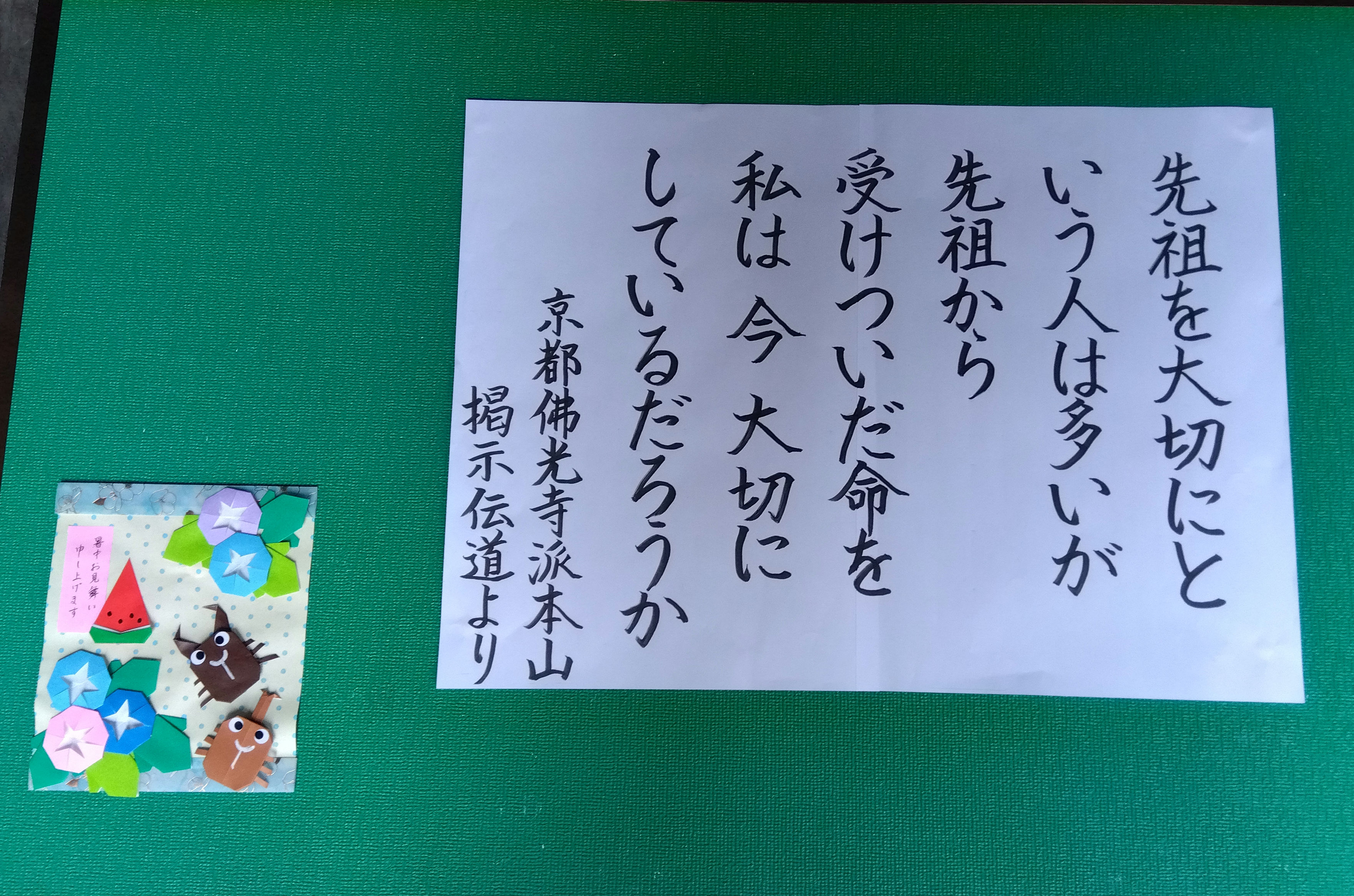 南無阿弥陀仏が満ち満ちた今日一日を過ごせることに感謝します。そしてそれは、ご先祖の方々が南無阿弥陀仏を受け継いで下さったおかげでありました。今、ここの命を大切にするとは、こうした生き方ではないでしょうか。称名。【副住職】