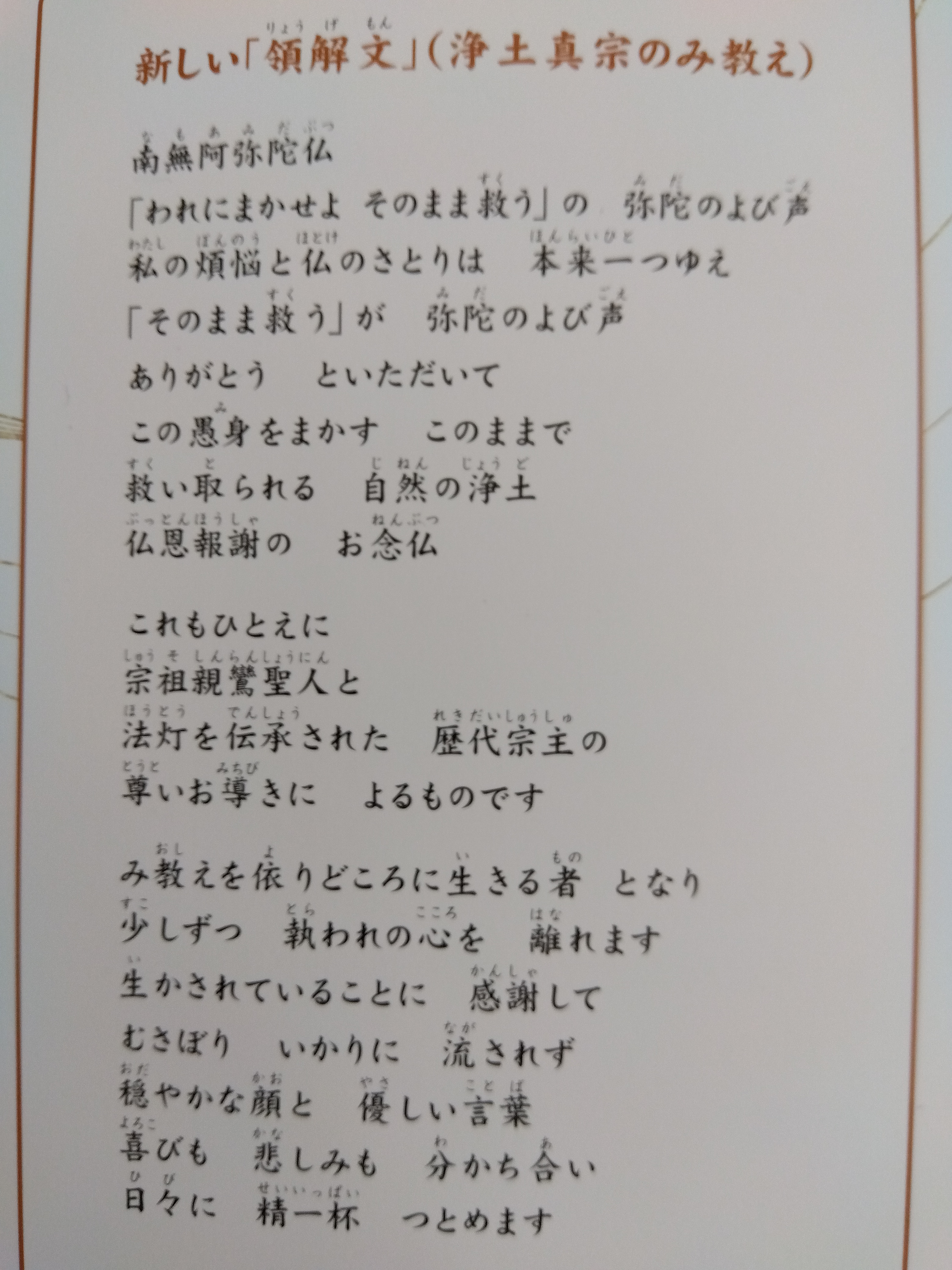 「み教えを拠りどころに生きる者となり、少しずつ執われの心を離れます。生かされていることに感謝して むさぼり、いかりに流されず、穏やかな顔と優しい言葉、喜びも、悲しみも分かち合い、日々に精一杯つとめます」