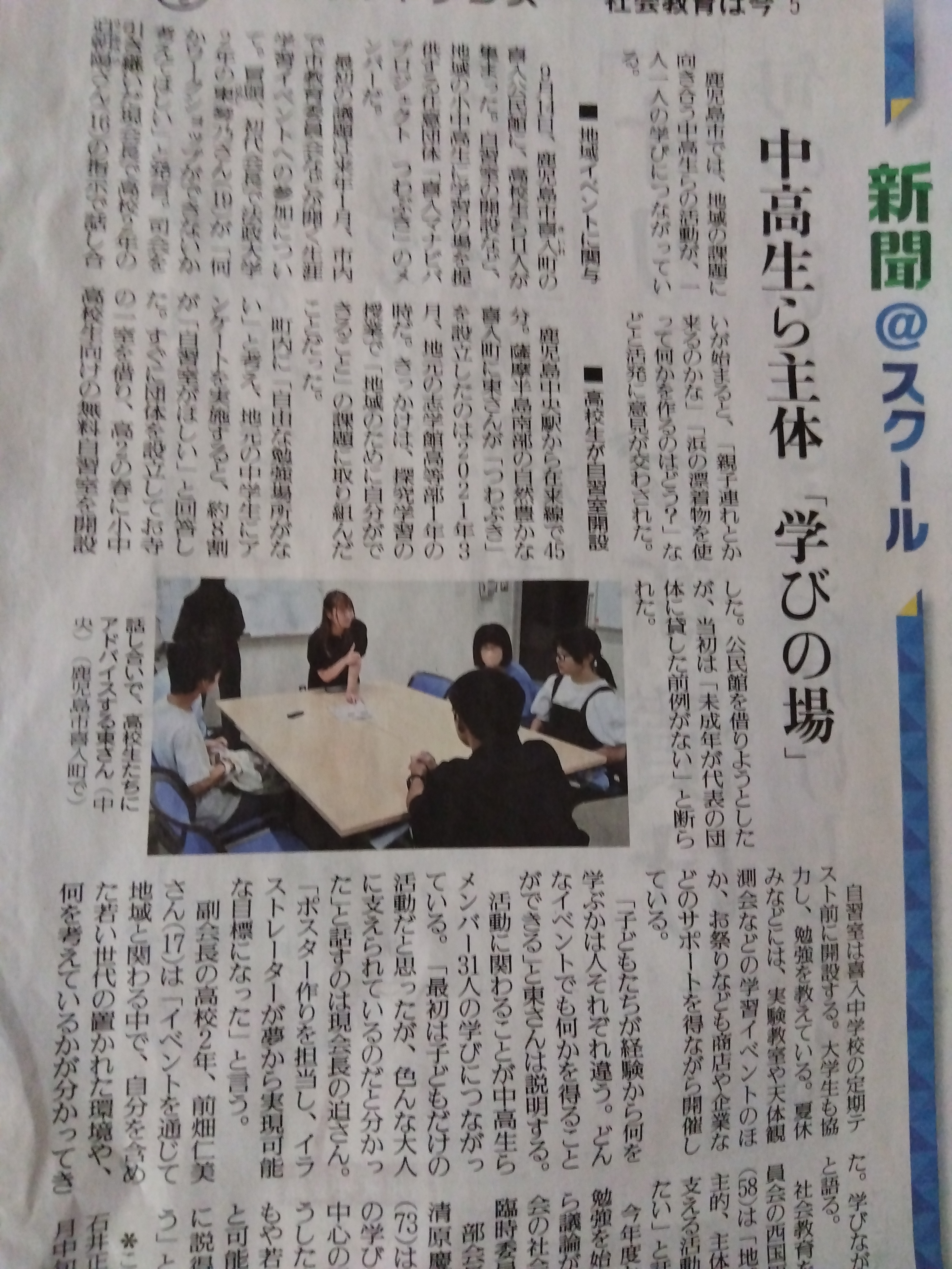 先日10月17日の讀賣新聞に"中高生ら主体「学びの場」"という記事がありました。