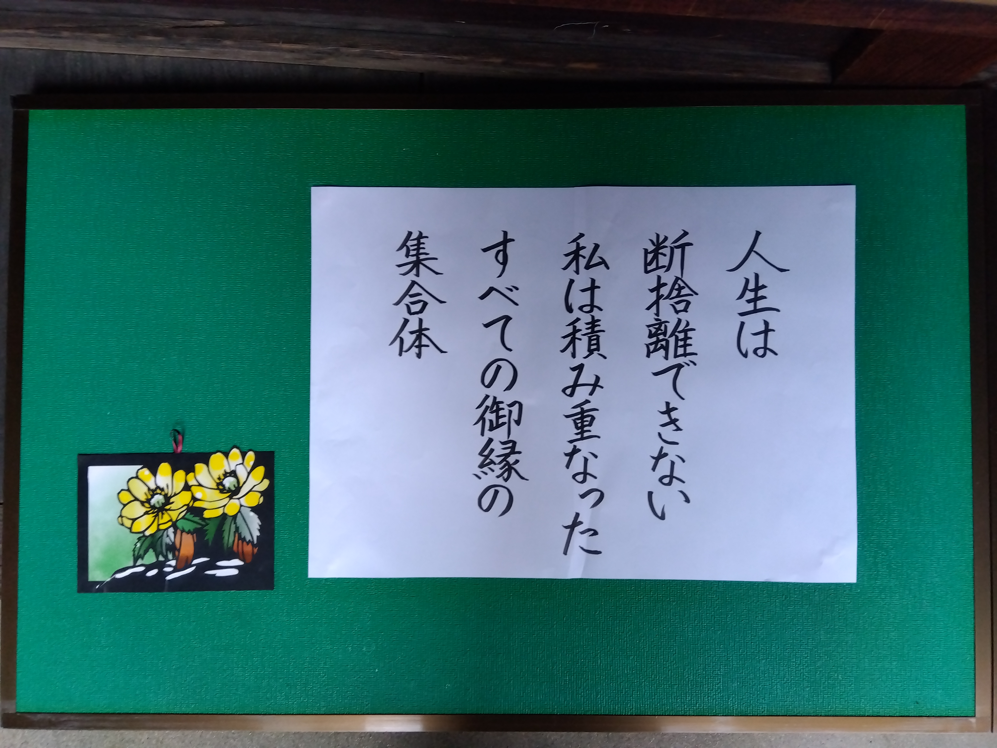 人生は断捨離できないとは、全てがわたしの「はからい」ではないということではないでしょうか。断捨離をするときは、要るもの、要らないものをわたしの主観で判断します。しかしながら、人生は「積み重なったすべてのご縁の集合体」ということです。すべてのご縁は私の「はからい」を超えています。私の都合の良し悪しではないということです。その意味で、すべてのご縁はご恩であると頂くことが出来ます。改めて浅原才一さんの詩をご紹介したいと思います。