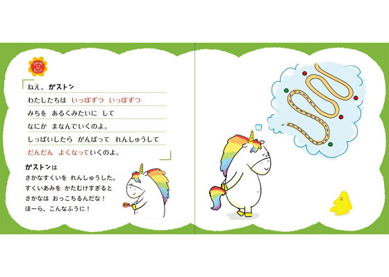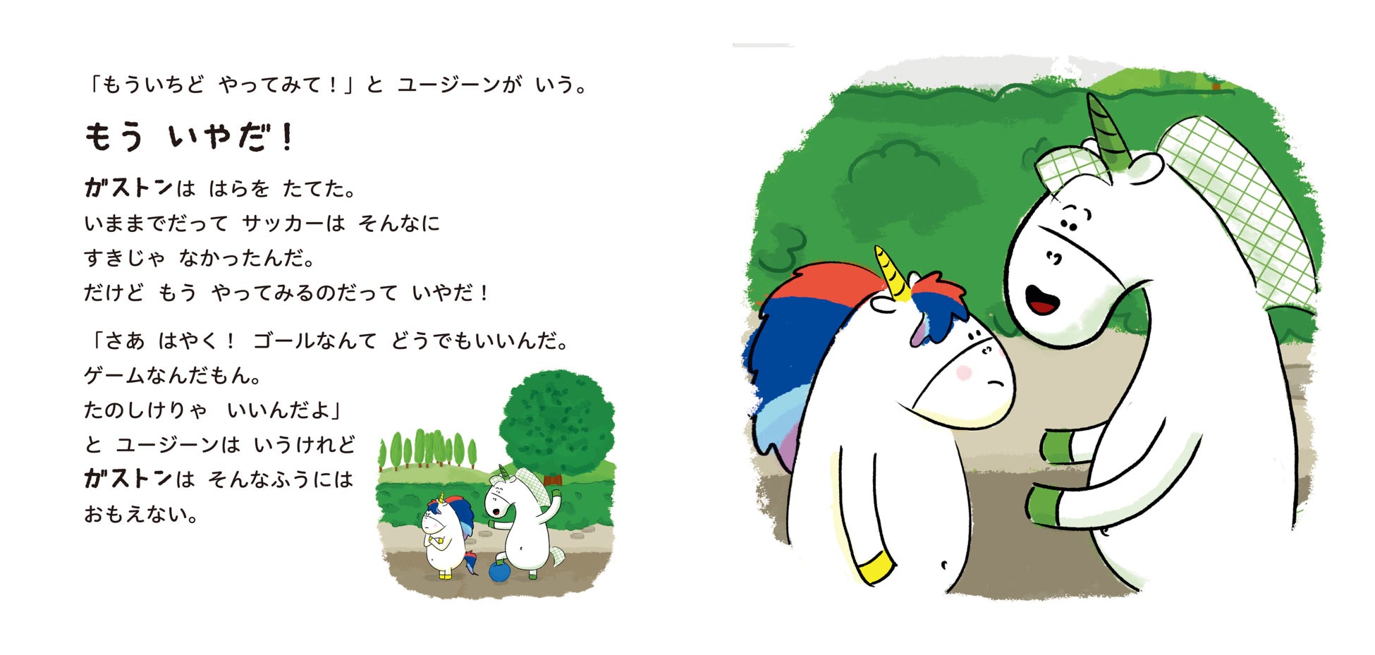 ガストンはサッカーをしていて、なかなか上手くシュートが決まらずイライラしていました。ママに「あせらず、あきらめず、いっぽいっぽすすめば上手になれるよ」と言われます。