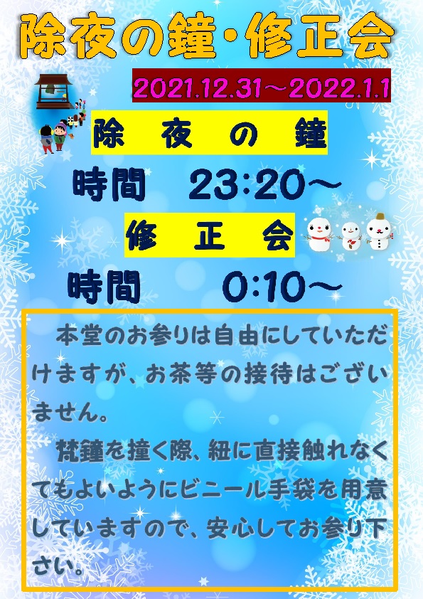 法要・法座 2021/12/30 除夜の鐘・修正会のご案内② いよいよ、明日の夜です。除夜の鐘23:20~修正会0:10~を予定しております。来寺される際は健康に留意し、マスク着用でご案内しています。また、梵鐘を撞く際は拙寺で用意しています使い捨て手袋を着用していただいたり本堂へのお参りの際、消毒をしていただくなど、感染予防のため、どうぞご理解とご協力をお願い申し上げます。