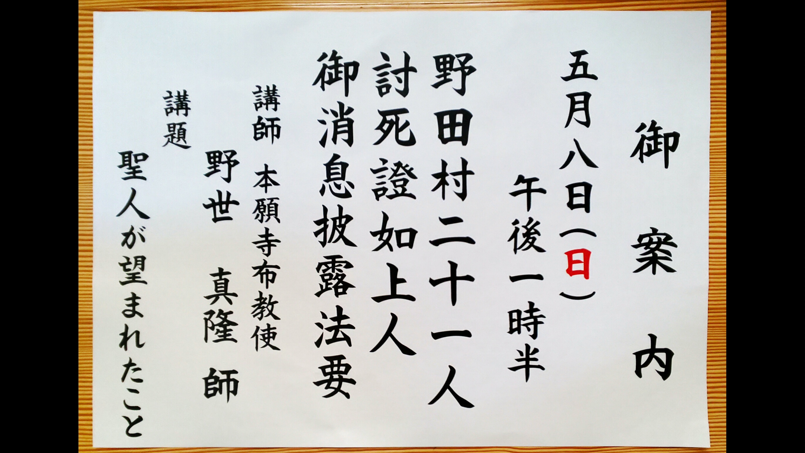法要・法座 2022/04/25 御消息披露法要のご案内 初夏の陽気になってまいりました。 さて、5月8日(日)、野田村二十一人討死證如上人御消息披露法要が厳修されます。大阪市指定の重要文化財でもあります、證如上人の御消息はこの法要でしか披露されません。 命懸けで浄土真宗の法灯を守り、今日に届けて下さったことへの感謝の法要です。 どうぞ皆様、万障繰り合わせの上御参詣下さいますようご案内申し上げます。