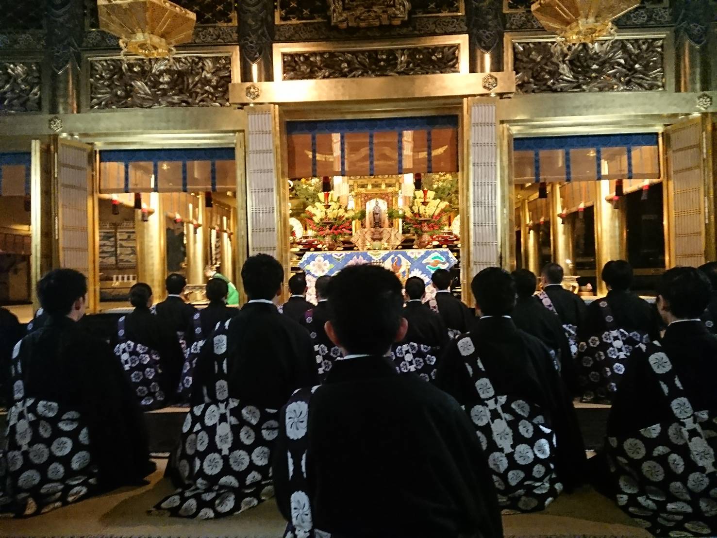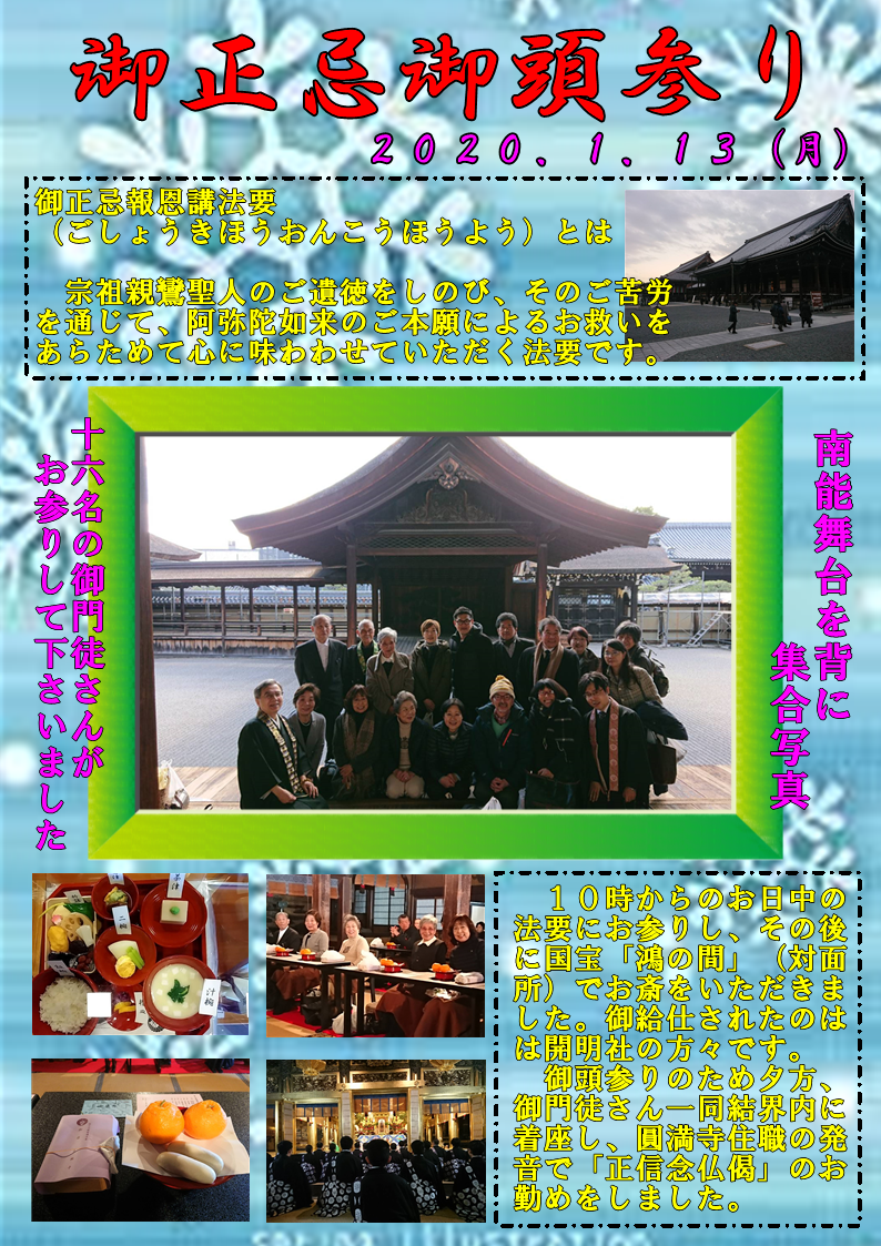 法要・法座 2020/01/13 御頭参り(おとうまいり)の報告 京都の本願寺の御正忌報恩講法要に毎年本願寺より案内があり御頭参り(おとうまいり)しています。日中の法要にお参りし、国宝の「鴻の間(こうのま)」でお斎(とき)をいただきます。そして夕方のお参りで圓満寺の御門徒さんと共に結界(けっかい)の中に入り、圓満寺院主の発音(はっとん)で「正信念仏偈」のお勤めを致します。 御正忌報恩講とは、宗祖親鸞聖人の御命日の法要です。