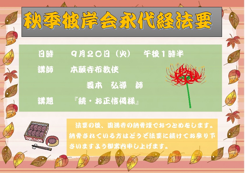 法要・法座 2022/09/15 秋季彼岸会永代経法要'22のご案内 先日の中秋の名月とても綺麗に見えましたね。今年はいつまでも暑い日が続きます。暑さ寒さも彼岸までと申しますが、少し涼しくなってほしいものですね。 さて、お彼岸が近づいて参りました。今年も義本先生がお取り継ぎ下さいます。浄土真宗ではお聴聞が大事です。お墓参りだけでなく、どうぞ皆さんとともに義本先生のお話を聴かせていただきましょう。 皆様お誘い合わせの上御参詣下さいますよう御案内申し上げます。