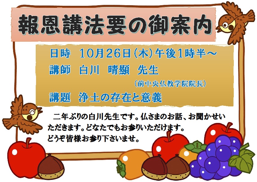 法要・法座 2023/10/05 報恩講法要'23のご案内 10月26日(木)13時半より報恩講法要が厳修されます。 ご講師は二年ぶりの白川晴顯先生、広島よりお越しいただきます。 報恩講は、浄土真宗で一番大事にされている法要です。まだ今年お寺にお参り出来てない方も、今年最後の法要です。どうぞ皆様お誘い合わせの上お参り下さいませ。