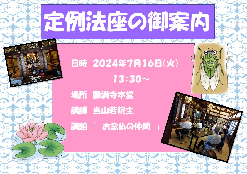 法要・法座 2024/07/05 定例法座’24のご案内 梅雨も明けていないのに暑い日が続きます。皆様水分補給をしたり、暑い中での活動後には冷やしたり安静にしたりされてますでしょうか?無理をすると熱が蓄積されてしまい夜中でも朝方でも熱中症になるそうです。夜は安静に過ごして体調もリセットしましょう。さて、7月16日は定例法座の日です。講師は若院主が務めます。どうぞ皆様お誘い合わせの上ご参詣くださいますようご案内申し上げます。