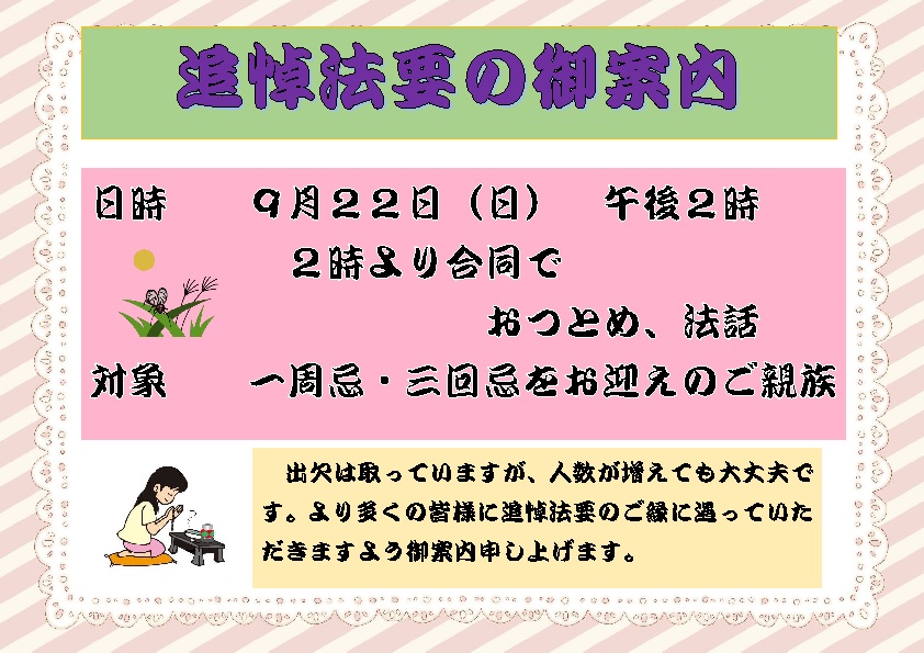 法要・法座 2024/09/15 追悼法要’24のご案内 9月22日(日)午後2時から追悼法要が厳修されます。 一周忌、三回忌をお迎えの御親族の方に御案内しております。出欠いただいておりますが、当日多少人数が増えても大丈夫です。一人でも多くの方に仏縁に遇っていただければと思います。どうぞ皆様御参詣下さいませ。
