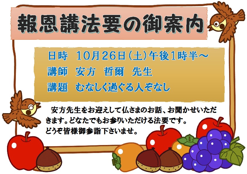 法要・法座 2024/10/15 報恩講法要24のご案内 先日は報恩講法要に向け仏具のおみがきをしていただきました。少しずつ準備が進んでいます。報恩講は浄土真宗で一番大切な法要です。親鸞聖人の御命日にご遺徳を偲び、み教えを改めてお聞かせいただく法要です。門信徒として必ずお参りいただきたい法要です。 安方先生はもう何度かご縁のある先生で、わかりやすいお話をして下さいます。どうぞ皆様御参詣下さいますよう御案内申し上げます。