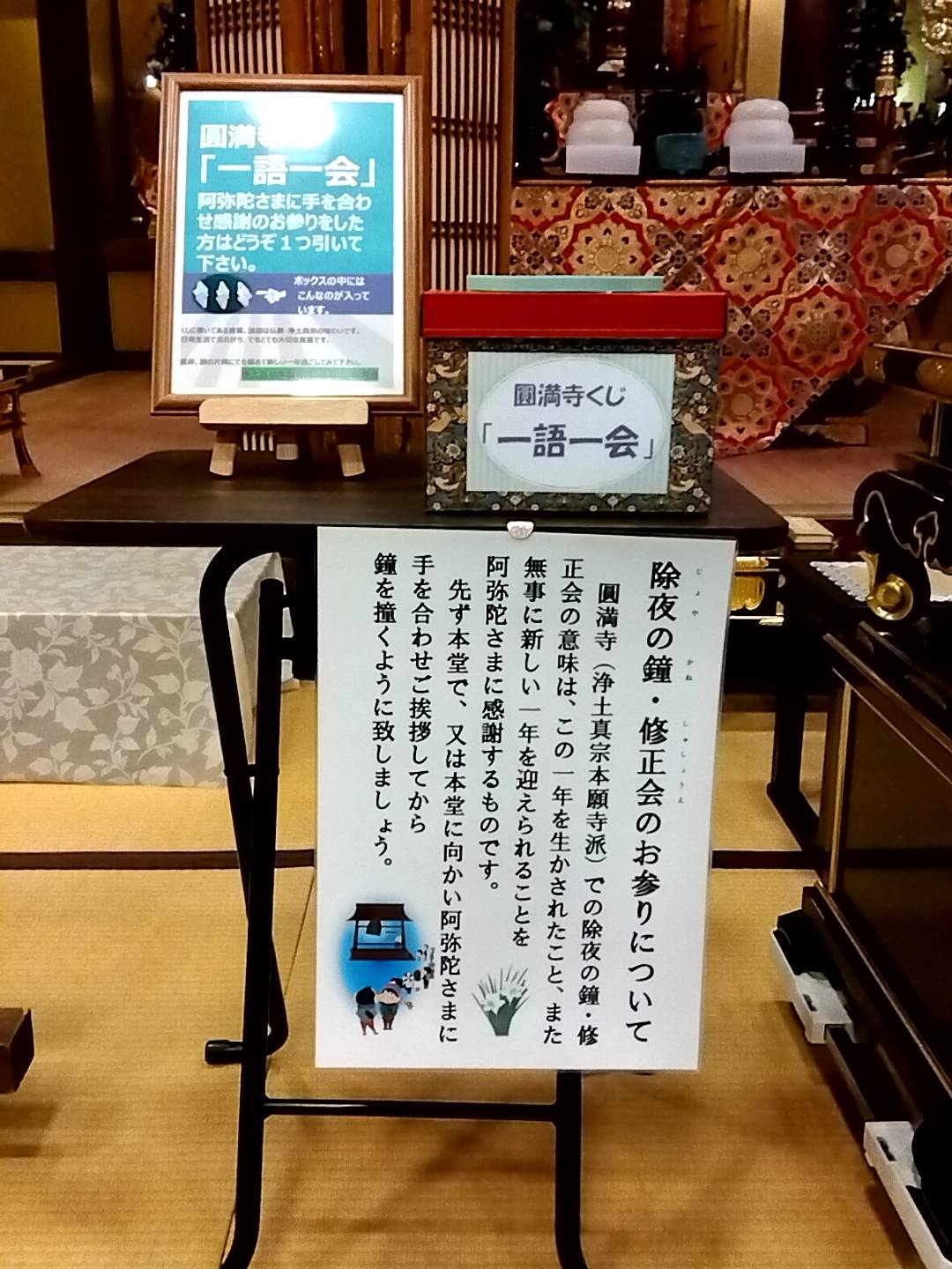 今年も多くの方がお参り下さいました。若院主の友人が誘導を手伝って下さったり、圓満寺仏教婦人会の方がお茶等の接待をお手伝い下さり、おかげさまで無事に除夜の鐘・修正会を勤修することが出来ました。ありがとうございました。