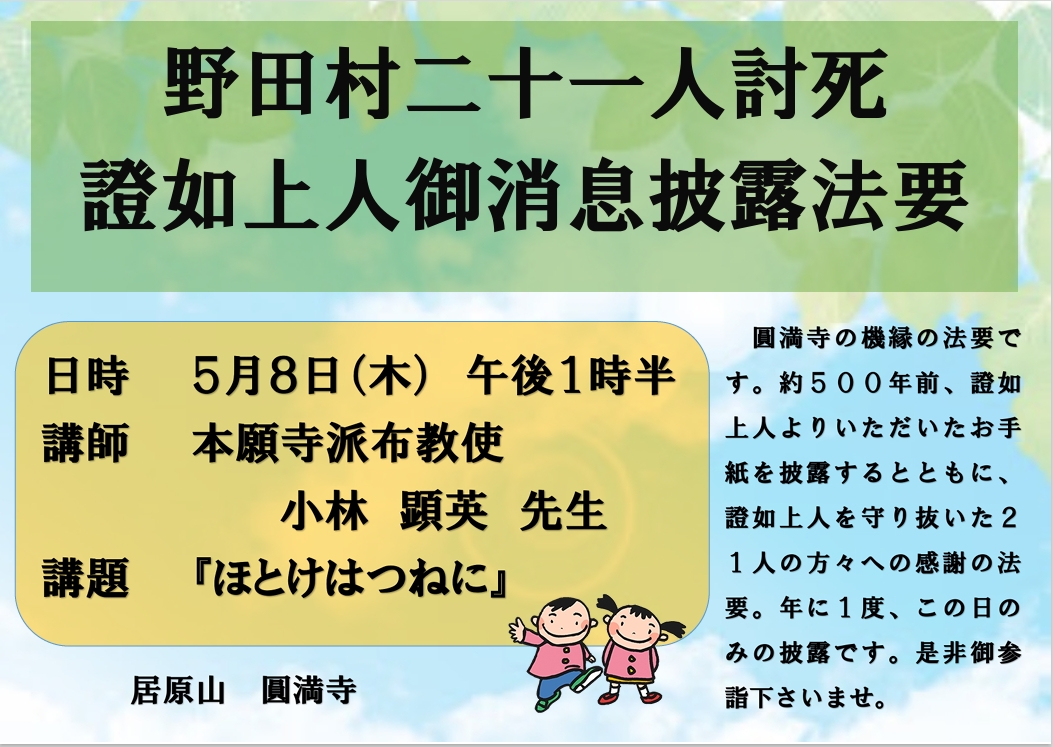 法要・法座 2025/04/15 證如上人御消息披露法要’25のご案内 野田村二十一人討死 證如上人御消息披露法要 講師 小林 顕英 先生 講題 「ほとけはつねに」 5月8日(木)13時半 ※12時半より玉川コミュニティの碑の前でおつとめします。どうぞそちらにもお参り下さいませ。