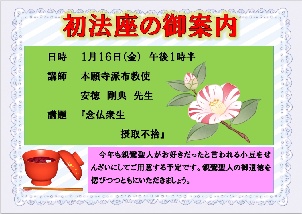 法要・法座 2026/01/05 令和8年初法座のご案内 今年の初法座は昨年に続き、安徳先生がご法話してくださいます。また、親鸞聖人のご命日にお好きだった小豆に因んでぜんざいをお出しします。親鸞聖人のご遺徳を偲びつつ、皆さんでいただきましょう。 どなたでもお参りいただけますのでお誘いあわせの上御参詣いただきますようご案内申し上げます。