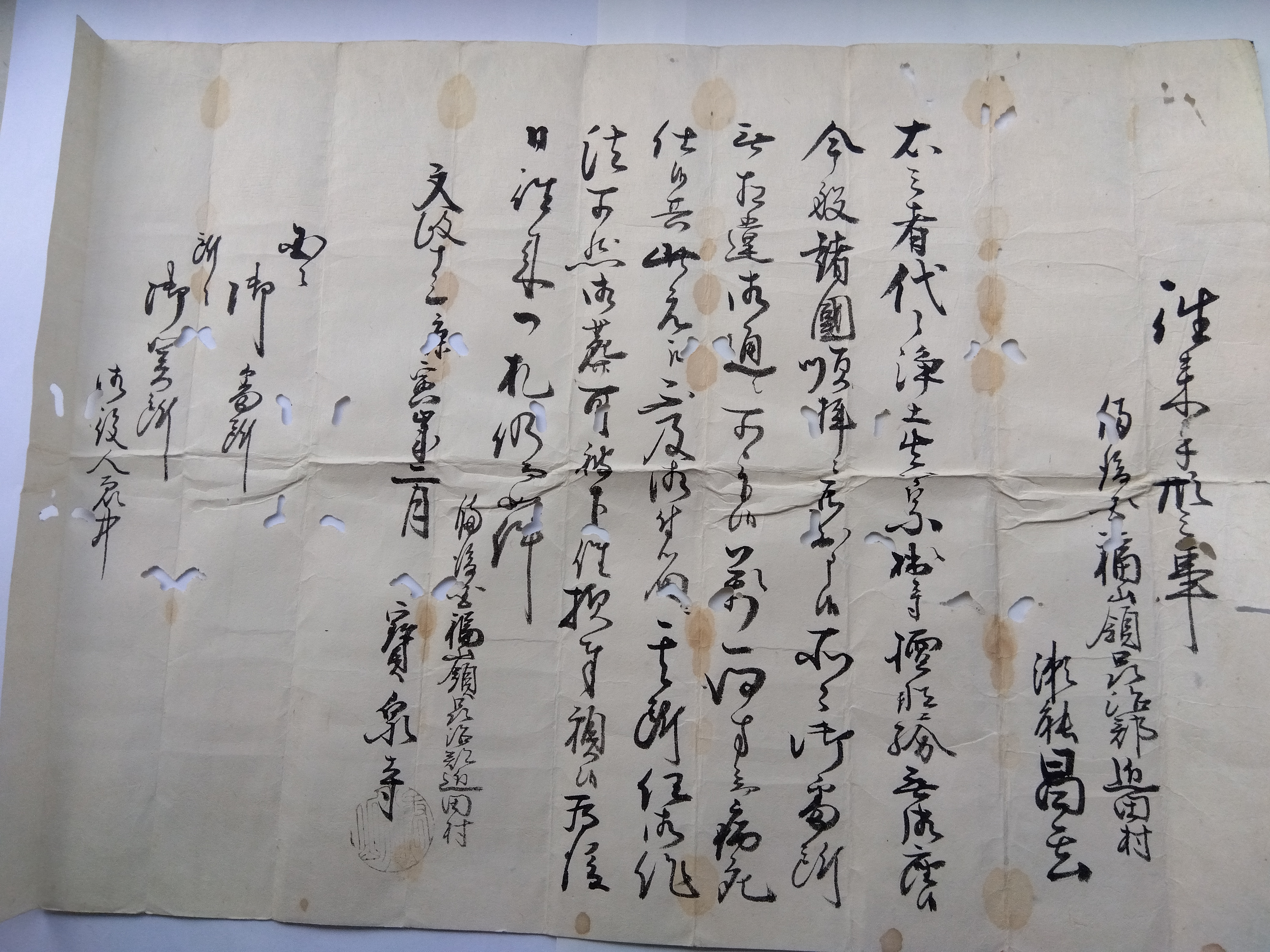 1830(文政13)年2月に備後国福山領(現在の広島県福山市)寶泉寺から瀬能昌玄に出された往来手形です。名字がありますので身分の高い人かもしれません。