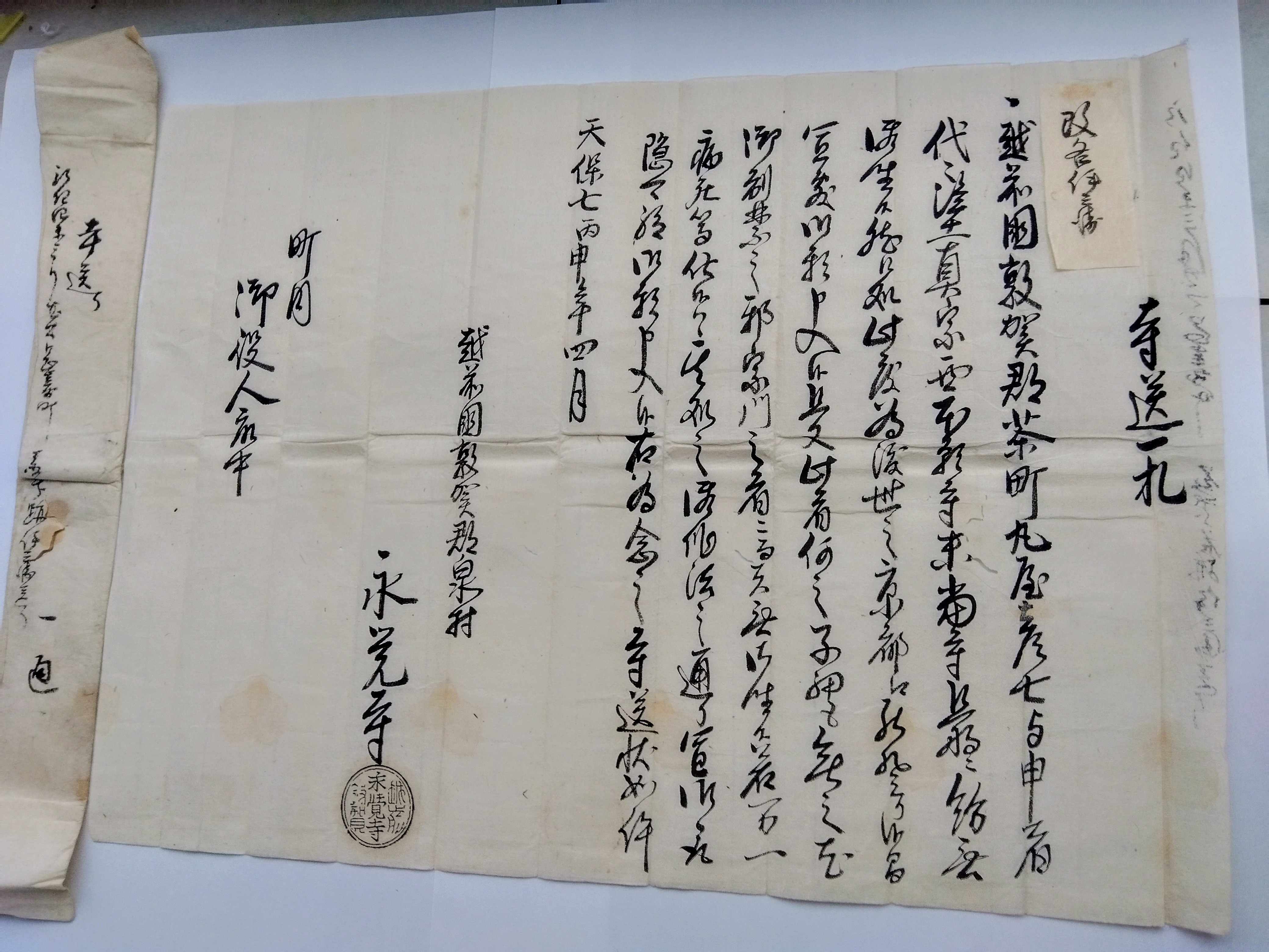 この送り状には包紙があり、「寺送り 一通 弘化四未三月岡嵜町藤次郎名跡伊兵衛送り」と記されています。