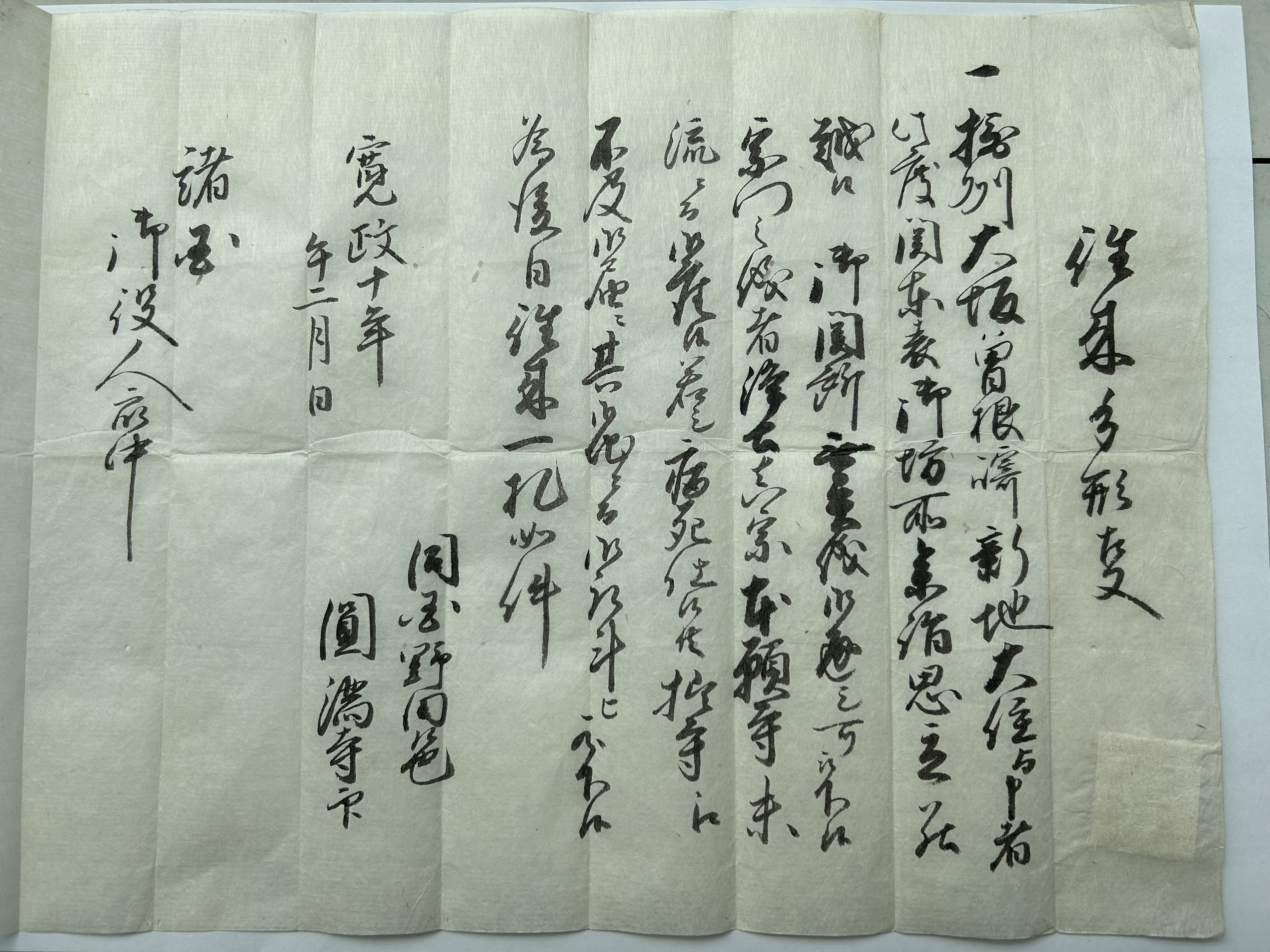 関東の御旧跡参詣のため必要な往来手形であったようで帰住後圓満寺へ返還されたものと思われる。