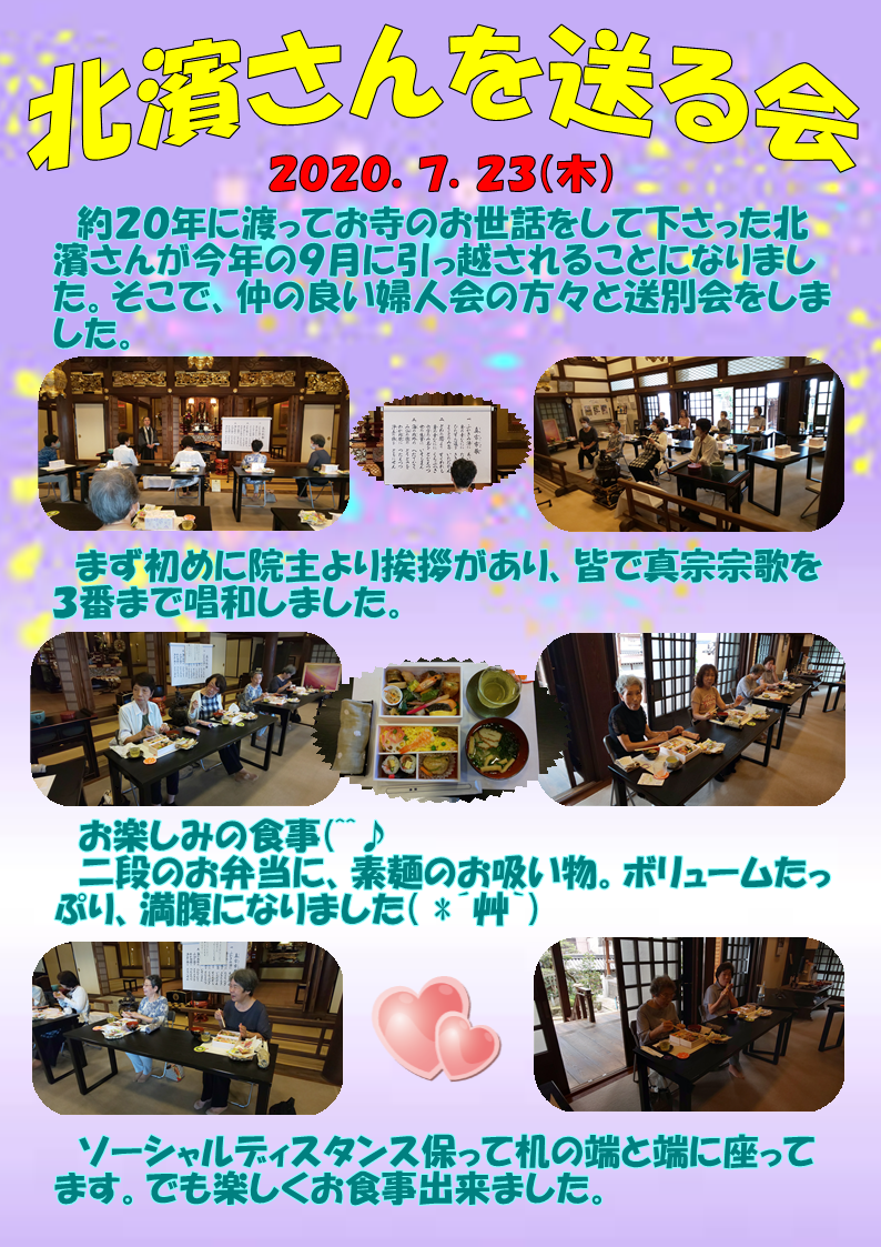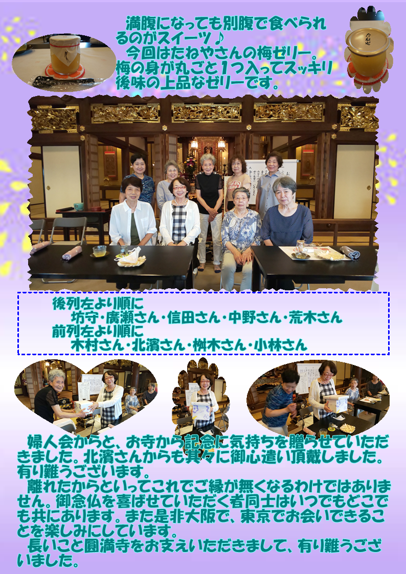 長年、圓満寺仏教婦人会の会員として圓満寺を支えて下さった北濱さんが東京へ引っ越されることとなりました。