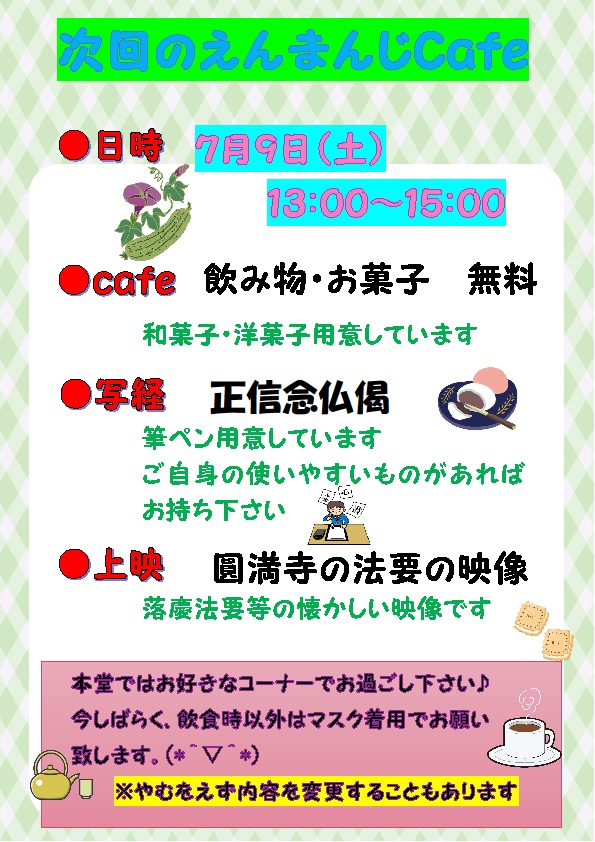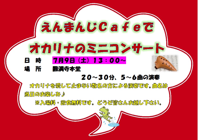 お知らせ 2022/06/27 えんまんじcafe22'7月のご案内 次回のえんまんじcafeは7月9日(土)13:00~15:00です。写経や折り紙等用意しておりますが、 この日は、13:00~オカリナ演奏があります。 オカリナを愛して止まない方々が演奏して下さいますよ。5~6曲の約30分くらいを予定しています。オカリナの優しい音色を本堂で聴いて心癒されてみませんか? 皆様のお越しをお待ちしております(^o^)/