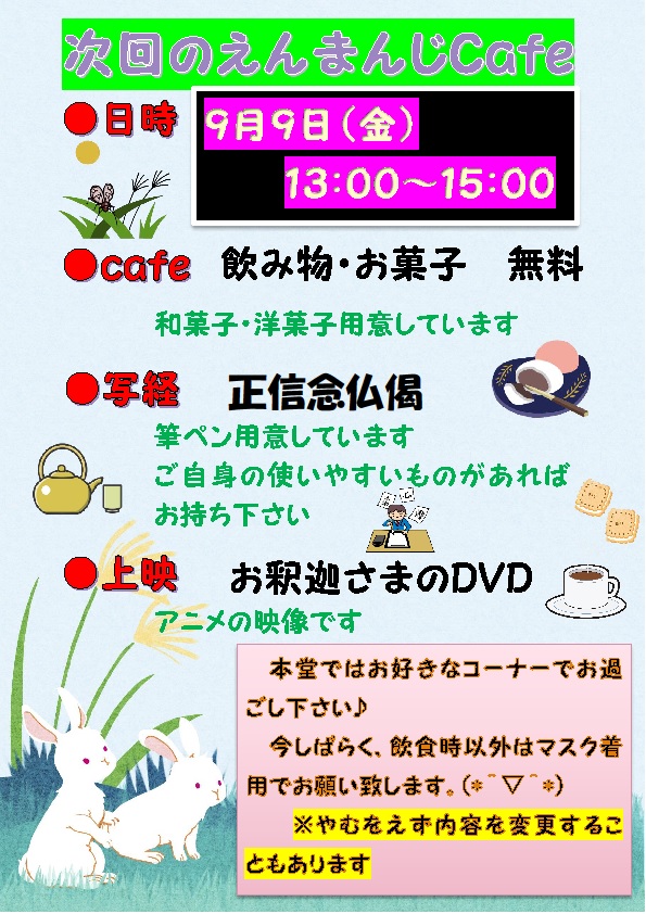 お知らせ 2022/08/25 9月のえんまんじcafeのご案内 9月のえんまんじCafeは 9月9日(金)13:00~15:00です。 写経や折り紙等の用意もあります。もちろん、お茶を飲んで会話を楽しんでいただいても(^^♪寺族の者と話したり、えんまんじCafeに来られた方同士で仲良くなったり。えんまんじCafeでは飲食、写経等全て無料で提供しています。 13:00~15:00の間、出入り自由なので気軽にお越し下さい(*^▽^*)