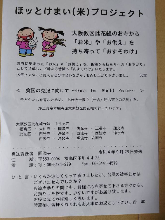 お知らせ 2022/09/27 ほッとけ米プロジェクト22'9月 今月も皆様にご協力いただきましたお陰で、此花区・港区の子ども食堂さんへお米等を寄贈することが出来ました。とても喜ばれております。 いつも快くご賛同・ご協力下さり、ありがとうございます。 今後もほッとけ米プロジェクト続けて参ります。どうぞ無理のない範囲でのご協力を宜しくお願い致します。 インスタグラムにも写真掲載していますので、良かったら下記「外部リンク」をタップしてインスタグラムもご覧下さい。