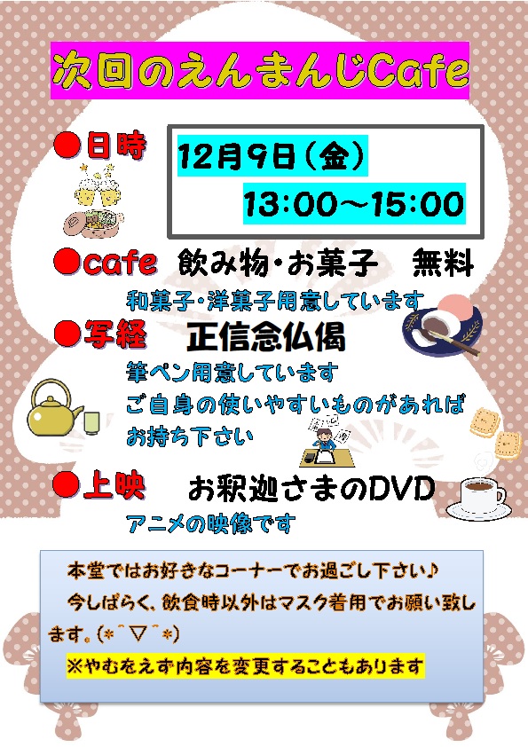 お知らせ 2022/11/25 えんまんじcafe22’12月のご案内 12月のえんまんじCafeは 12月9日(金)13:00~15:00です。 写経や折り紙等の用意もあります。もちろん、お茶を飲んで会話を楽しんでいただいても(^^♪寺族の者と話したり、えんまんじCafeに来られた方同士で仲良くなったり。えんまんじCafeでは飲食、写経等全て無料で提供しています。 13:00~15:00の間、出入り自由なので気軽にお越し下さい(*^▽^*)