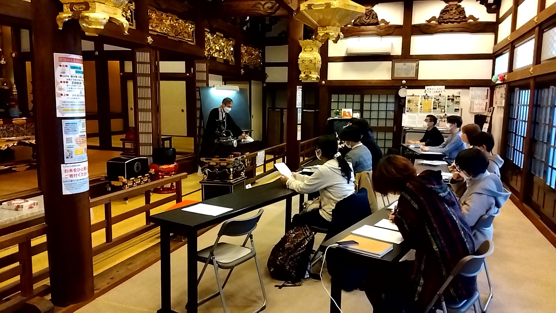 先日、きのくに国際高等専修学校の生徒さんがフィールドワークの一環で来寺されました。社会の構造や人間の心理を考える中、どのような心持ちが大切なのかを学ぶものでした。なかなか難しい内容でしたが、一生懸命に聴き、しっかりとした質問や感想もいただきました。