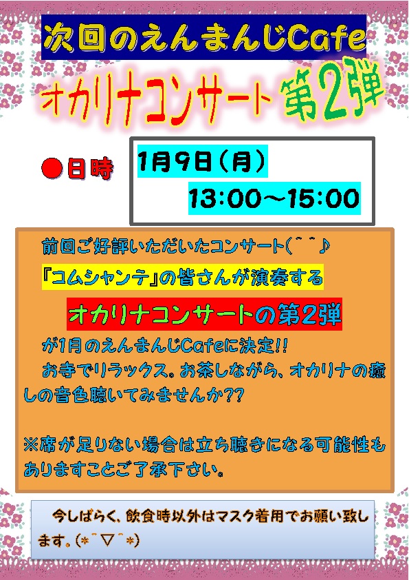 1月9日(月)のえんまんじcafeは、第2回オカリナコンサートです。オカリナの音色に癒されて始まる1年、素敵ですねぇ。