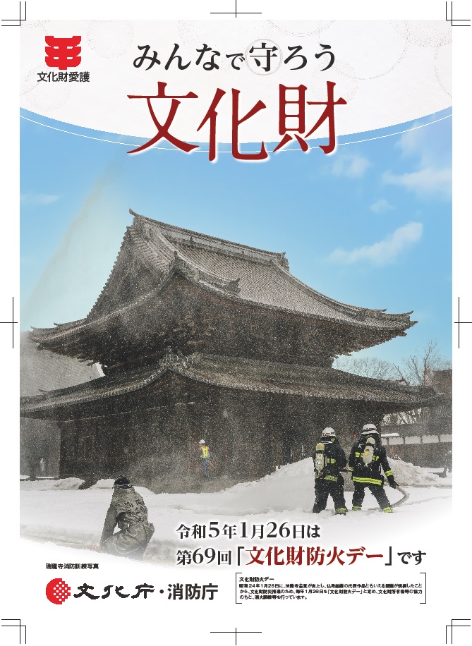 この「文化財防火デー」は昭和24年1月26日に奈良県・法隆寺の国宝建築物・金堂から出火し、壁画が焼損したことに由来します。この火災を契機として、貴重な文化財を火災や震災などから守るため、昭和30年に国が毎年1月26日を「文化財防火デー」と定めてから、今年で69回目を数えます。