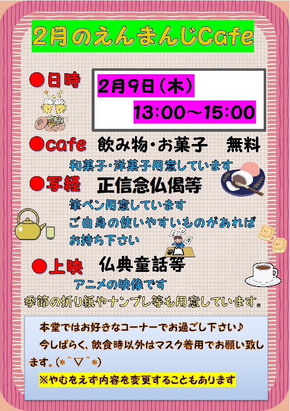 お知らせ 2023/02/05 えんまんじカフェのご案内23'2月 2月のえんまんじCafeは 2月9日(木)13:00~15:00です。 写経や折り紙等の用意もあります。もちろん、お茶を飲んで会話を楽しんでいただいても(^^♪寺族の者と話したり、えんまんじCafeに来られた方同士で仲良くなったり。えんまんじCafeでは飲食、写経等全て無料で提供しています。 13:00~15:00の間、どなたでも出入り自由なので気軽にお越し下さい(*^▽^*)