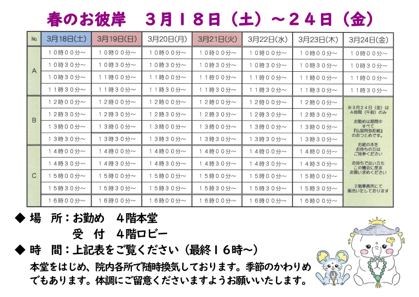 3月20日(月)13時半~は圓満寺の彼岸会永代経法要へお参りいただき、期間中に津村別院(北御堂にもお参りしてみませんか??