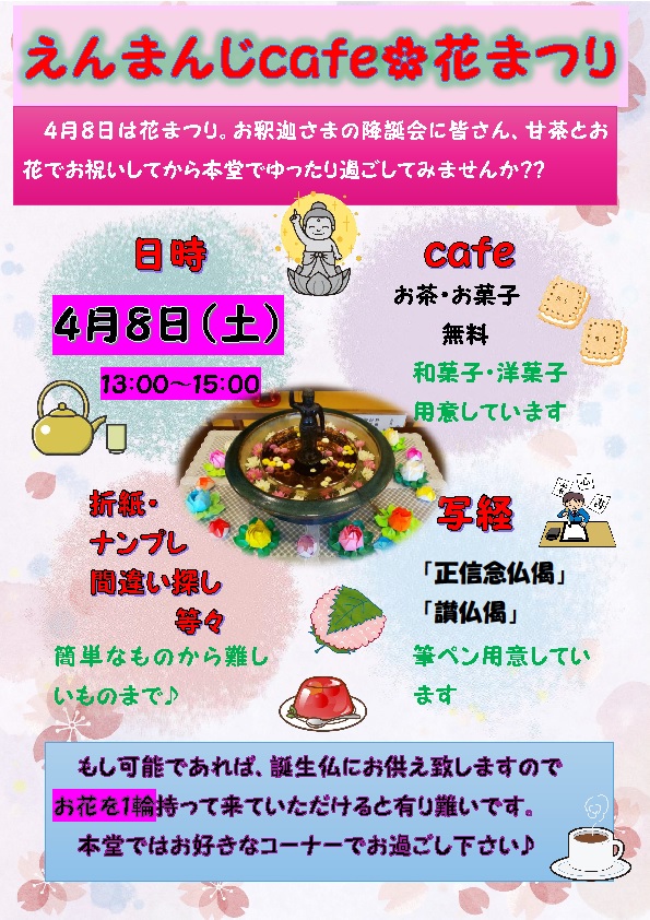 お知らせ 2023/03/25 えんまんじCafe23’4月~花まつり~ 4月8日はお釈迦さまがお生まれになった日です。圓満寺では 4月8日(土)13:00~15:00のえんまんじCafeにて誕生仏に甘茶をおかけしてお祝い致します。普段あまり飲むことの無い甘茶をいただいたり、折り紙、間違い探し、ナンプレ、写経などで自由にお過ごしいただけます。勿論、誕生仏に甘茶をかけるだけ、お茶するだけでもどうぞお気軽にお立ち寄りくださいませ。