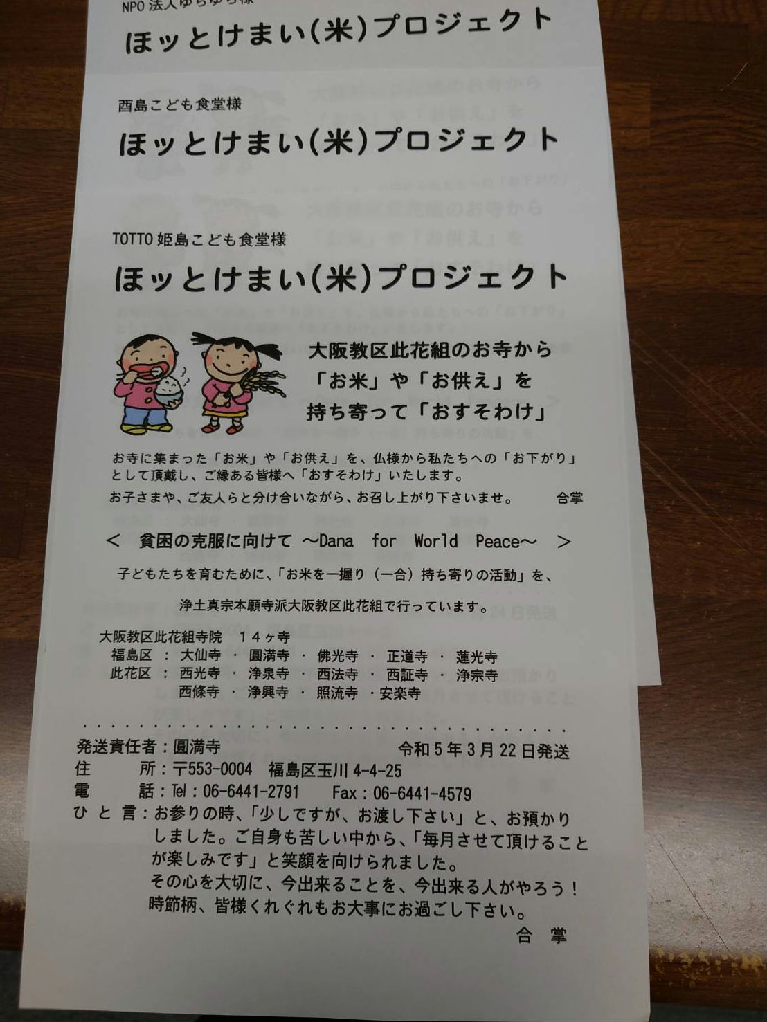 お知らせ 2023/04/26 ほッとけ米プロジェクト23’4月のご報告 今月も皆様にご協力いただきましたお陰で、此花区・港区の子ども食堂さんへお米等を寄贈することが出来ました。とても喜ばれました。 いつも快くご協力下さり、ありがとうございます。 新年度に入り期待と不安が入り交じった時期を過ごしている子どもたちです。お腹いっぱい楽しく食べて元気に遊び、学び過ごして欲しいですね。 インスタグラムにも写真掲載していますので、良かったら下記「外部リンク」をタップしてインスタグラムもご覧下さい。