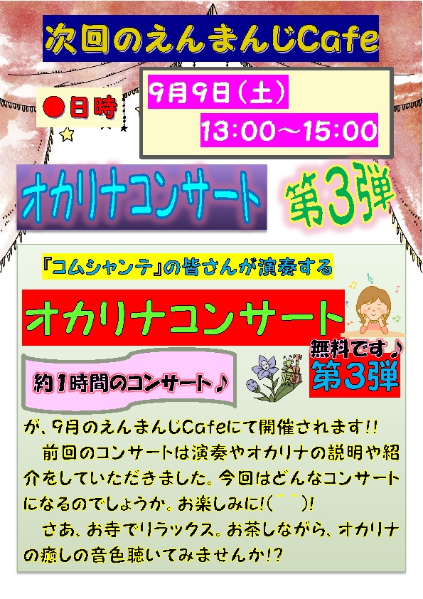 お知らせ 2023/08/25 えんまんじcafe23’9月のご案内 9月のえんまんじcafeはオカリナコンサートです!曲目は当日のお楽しみ(^_^)/cafeの時間はいつも通りで、その内の約1時間くらいをオカリナコンサートの予定にしています。 9月9日(土)13~15時です。どんなコンサートになるのか楽しみですね。どうぞ気軽にお越し下さいませ♪