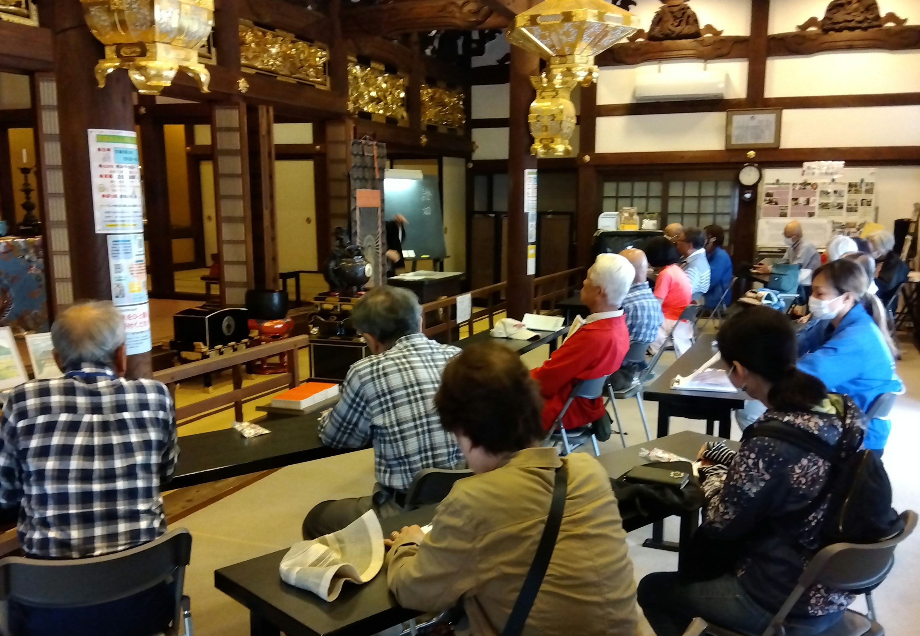 本堂に入り、合掌礼拝から始まり、当山院主が圓満寺の歴史や、現在どんな活動をしているかの説明をさせていただきました。