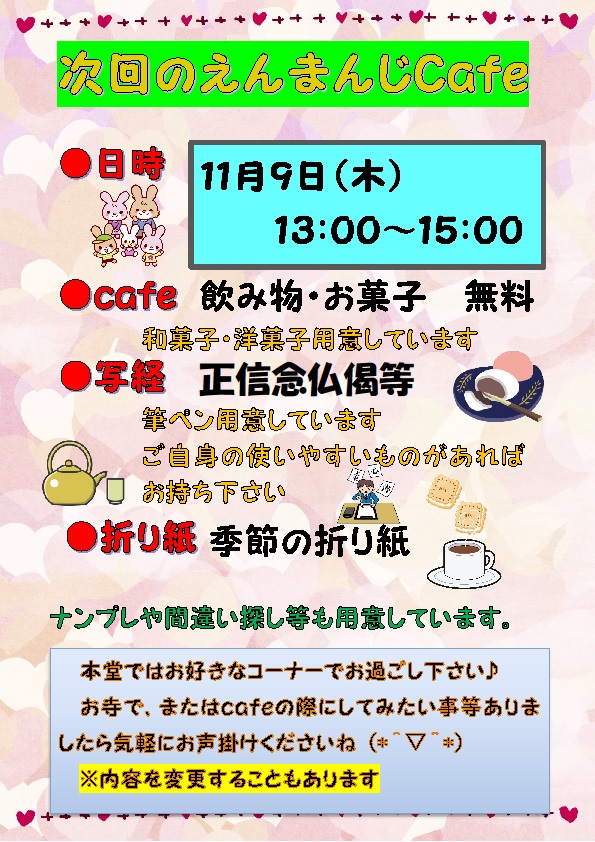 お知らせ 2023/10/25 えんまんじCafe23’11月の御案内 さて、大分秋らしくなって参りました。朝晩と日中の気温差がありますが、皆様お変わりありませんか??11月のえんまんじcafeは、 11月9日(木)13~15時です。皆さん、えんまんじcafeで楽しく過ごして寒さや風邪も吹き飛ばして参りましょう(*^▽^*) 良かったらお友達と一緒にお立ち寄り下さいね。初めていらっしゃる方も大歓迎です。