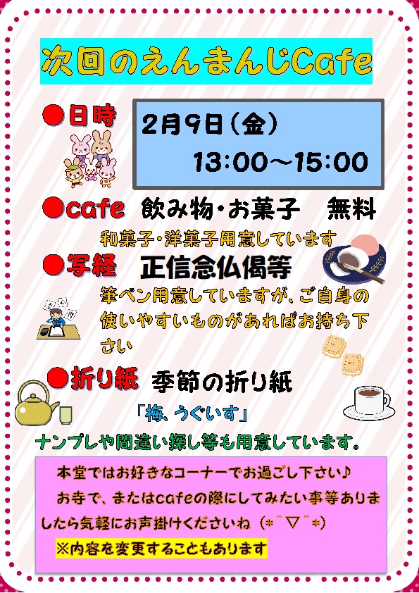 お知らせ 2024/01/25 えんまんじcafe24'2月のご案内 寒さの中にも少しずつ日が長くなり、日中の陽射しには暖かさを感じますね。今年も寺犬阿弥も寺猫テンも境内で仲良く日向ぼっこを楽しんでいます。 さて、2月のえんまんじcafeは、 2月9日(金)13~15時です。今月の折り紙は「梅とうぐいす」です。写経、ナンプレ等もご用意しています。 お時間ある方はふらっといらっしゃいませんか?ご家族、お友達とどうぞ。初めていらっしゃる方も大歓迎です。ゆったりとしたお時間をどうぞ♪