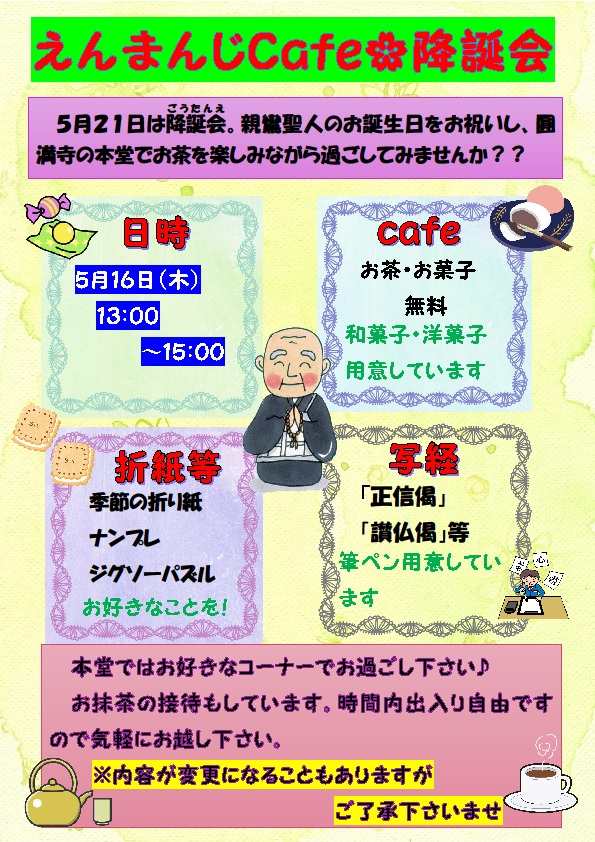 お知らせ 2024/04/15 えんまんじcafe’令和6年5月~親鸞聖人降誕会~のご案内 5月16日(木)のえんまんじcafeでは、浄土真宗の開祖である親鸞聖人のお生まれになった日(5月21日)をお祝いして、ゆっくりしながらも楽しく過ごしていただこうと考えています。 お抹茶の接待もありますので、どうぞ皆様お越し下さいませ。略式、椅子ですのでお作法関係なし、楽しく美味しくいただきましょう♪