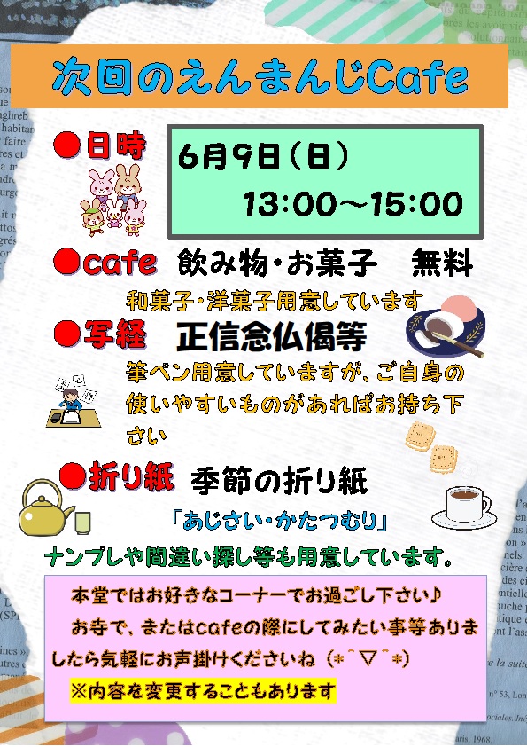 お知らせ 2024/05/25 えんまんじcafe24’6月のご案内 6月のえんまんじcafeは、 6月9日(日)13時〜15時です。 写経、ナンプレ、季節の折り紙のご用意もあります。将棋等もあります。普通に将棋するも良し、挟み将棋やまわり将棋等も面白いですよ。 1人で来られても、皆さんすぐに仲良くなられますので、お1人でもふら〜っと気軽にお越しください。もちろん、1人の時間をゆったり過ごされるのもオッケーです。 6月9日(日)お待ちしております。