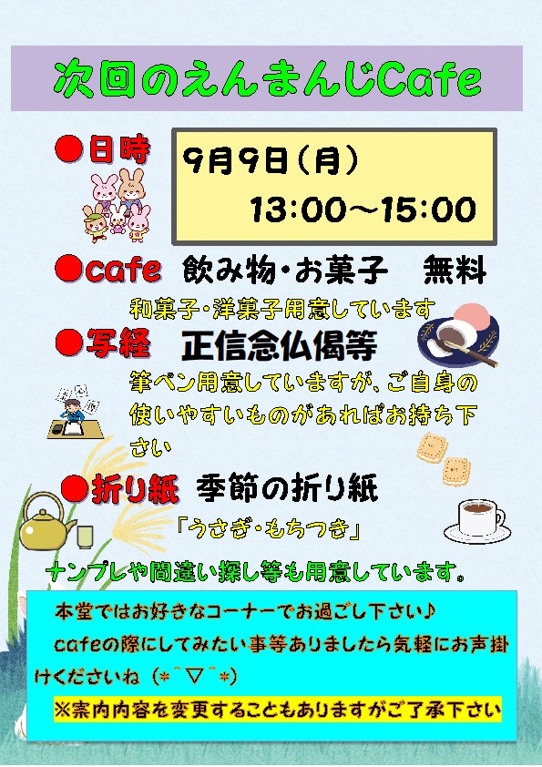 お茶をしながら、本堂を眺めるも良し、写経して心落ち着かせるも良し、寺族の者にお寺や仏事について普段聞けない、今更聞きづらい、なんてことも気軽にお尋ね下さい。