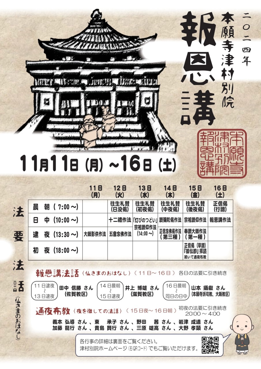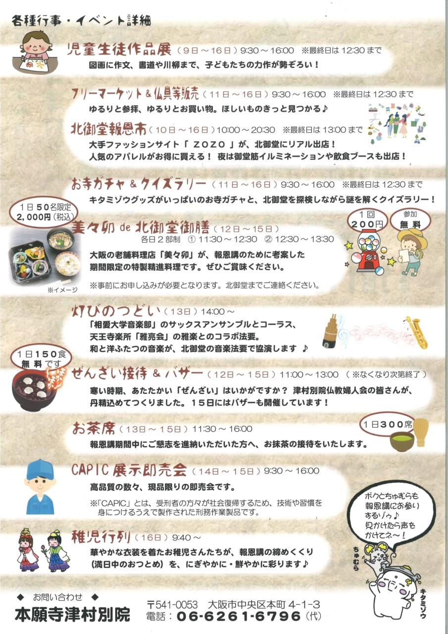 さて、11日から16日まで津村別院では報恩講が厳修されます。法要はもちろん、色々なイベントもありますので老若男女どなたでもお参りいただけます。