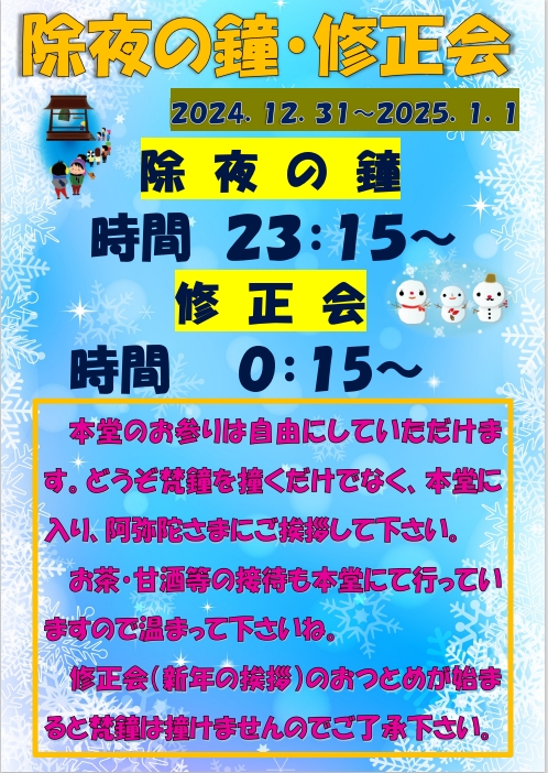 お知らせ 2024/12/05 除夜の鐘・修正会(令和6~7年)のご案内 今年も残すところ僅かとなりました。今年も除夜の鐘・修正会行いますのでご案内致します。 いつも見守って下さる阿弥陀様に今年も無事に過ごせたお礼を。そして無事に新年を迎えられる喜びを引き続き修正会で阿弥陀様にご報告、お礼申しましょう。 本堂では甘酒やお茶などご用意しております。どうぞ梵鐘を撞くだけでなく、本堂で仏さまにお礼して心も体も温まって下さいね。