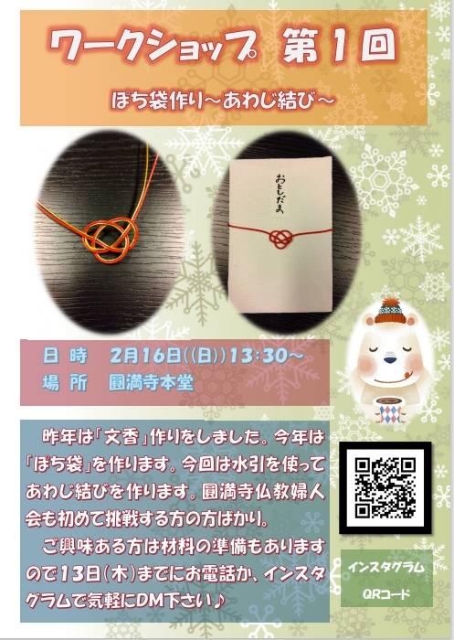 お知らせ 2025/02/05 ワークショップ令和7年第1回のご案内 今年初めてのワークショップ日時:2月16日(日)13:30〜場所:圓満寺本堂内容:ぽち袋作り対象:圓満寺仏教婦人会水引を使ったぽち袋作りをします。基本的には仏婦の方対象ですが、ご興味ある方、作ってみたい方もどうぞご参加下さい。参加には、材料の準備の都合上、13日(木)までにご連絡いただけますと助かります。お茶の時間も含め、15時頃終了予定です。皆様のご参加お待ちしております♪