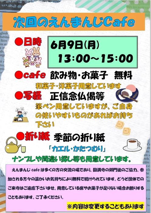尚、えんまんじcafeは多くの方の交流の場であり、圓満寺の御門徒のご協力、参加される方々の温かいお気持ちにより無料で続けられています。どうぞ団体でのご来寺はご遠慮下さいませ。おかげさまで多くの方がお越しくださるようになりましたので、用意している席やお菓子が足りない場合お断りすることもあります。ご了承ください。