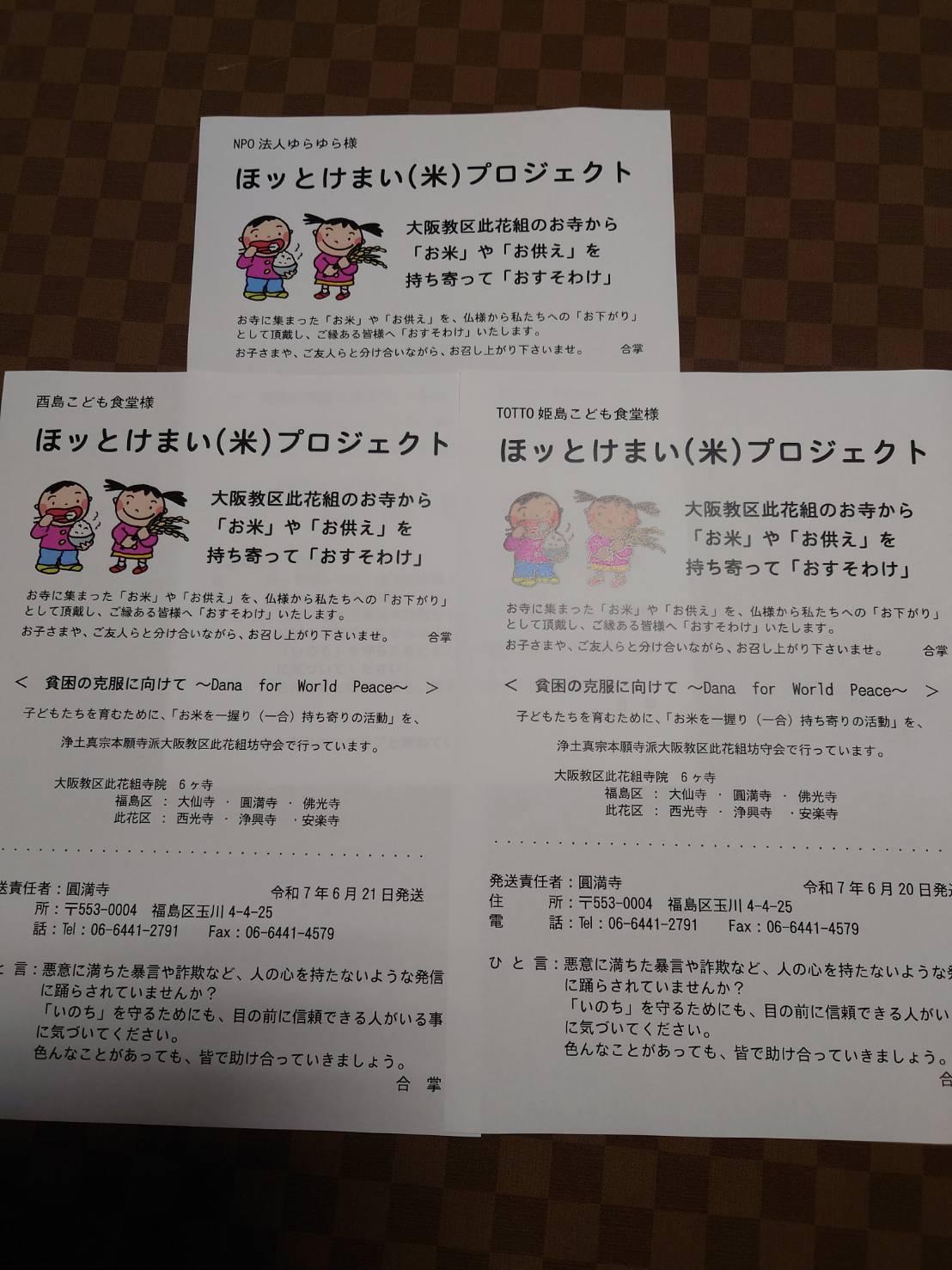 お知らせ 2025/06/30 ほッとけ米プロジェクト25’6月のご報告 ほッとけ米プロジェクト6月も皆様のおかげで無事に3箇所の子ども食堂さんにお届けすることが出来ました。まだまだお米の流通が不安定な中、ご協力いただきまして誠にありがとうございます。少しですが役立てていただけたら⋯とお参りや行事の際に、通りがかりにお持ち寄り下さいます。ホントに有り難いことです。早々に梅雨明けしました。暑さ厳しい折です。どうぞ皆様ご自愛下さいませ。今月もありがとうございました!