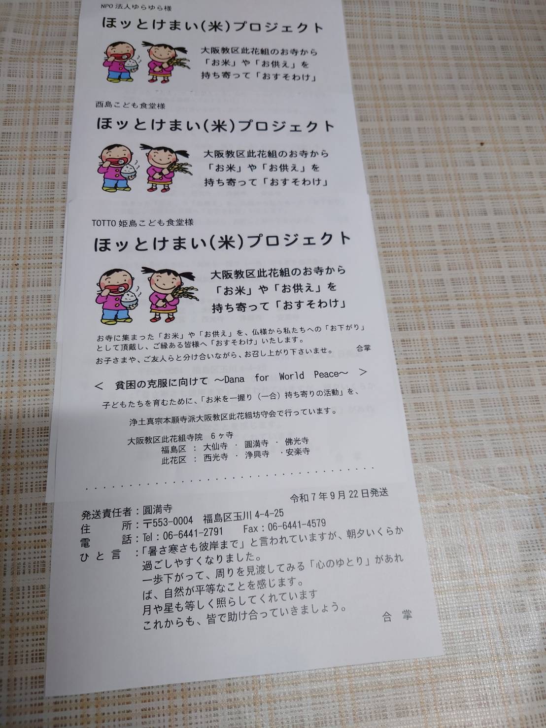 お知らせ 2025/09/28 ほッとけ米プロジェクト25’9月のご報告 今月も多くの方々のご協力により無事子ども食堂さんにお届けすることができました。 月参りの際、法事の際に用意してくださる方、お寺の行事でご来寺いただく時に持って来られる方、わざわざ持って来てくださる方。ホントにおかげさまです。 いつも快くご協力いただきまして誠にありがとうございます。