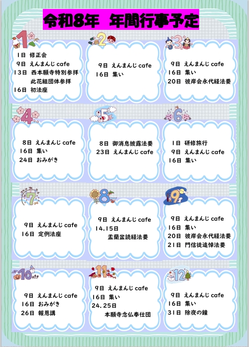 お知らせ 2025/12/30 令和8年行事予定表 令和8年も圓満寺ではたくさんの行事を行って参ります。御門徒の方以外も参加、お参り出来ます。どうぞお越し下さいませ。 変更も出てくると思いますが、毎月予定表をホームページの「お知らせ」にて掲載しますので、そちらもチェックの願いします。