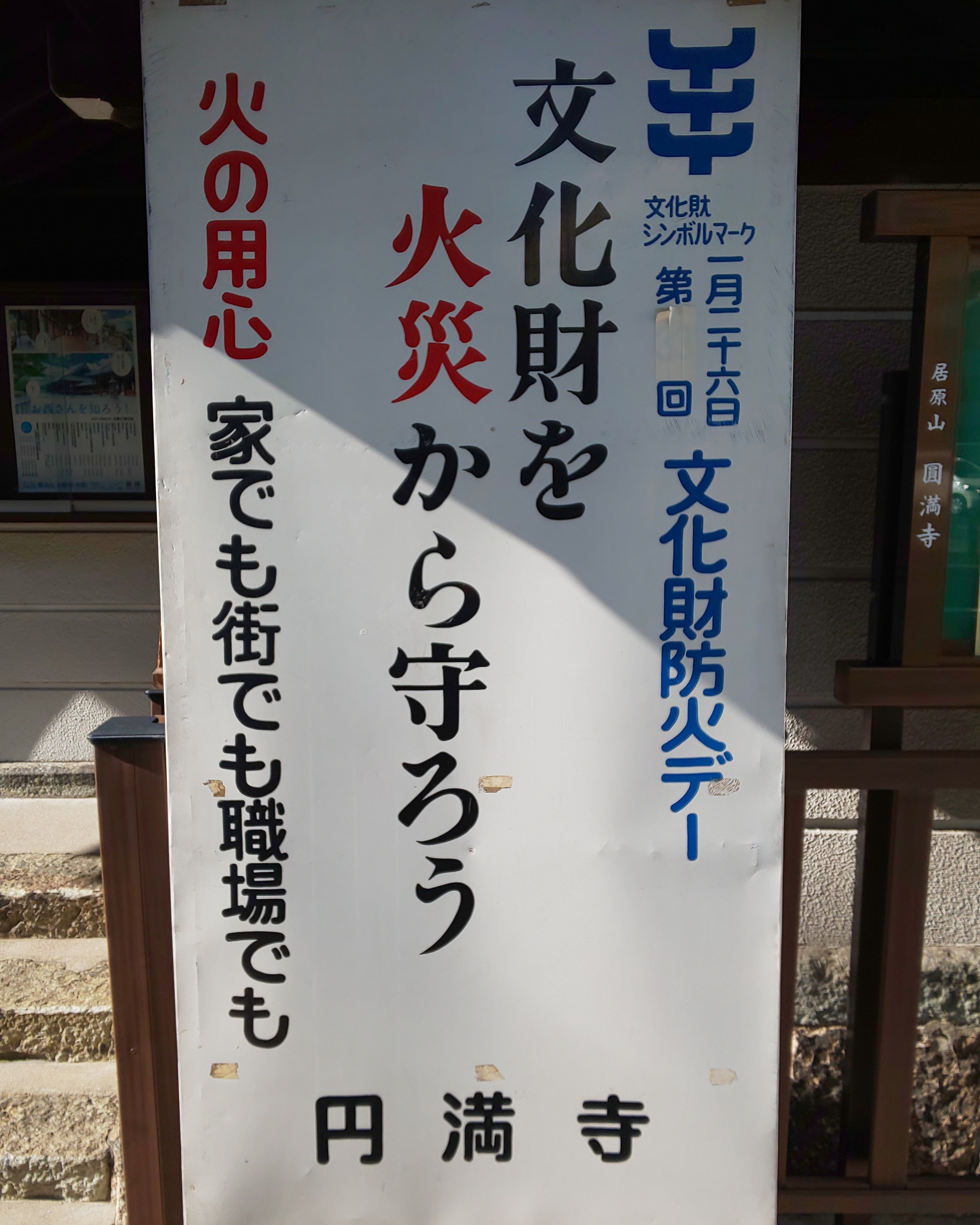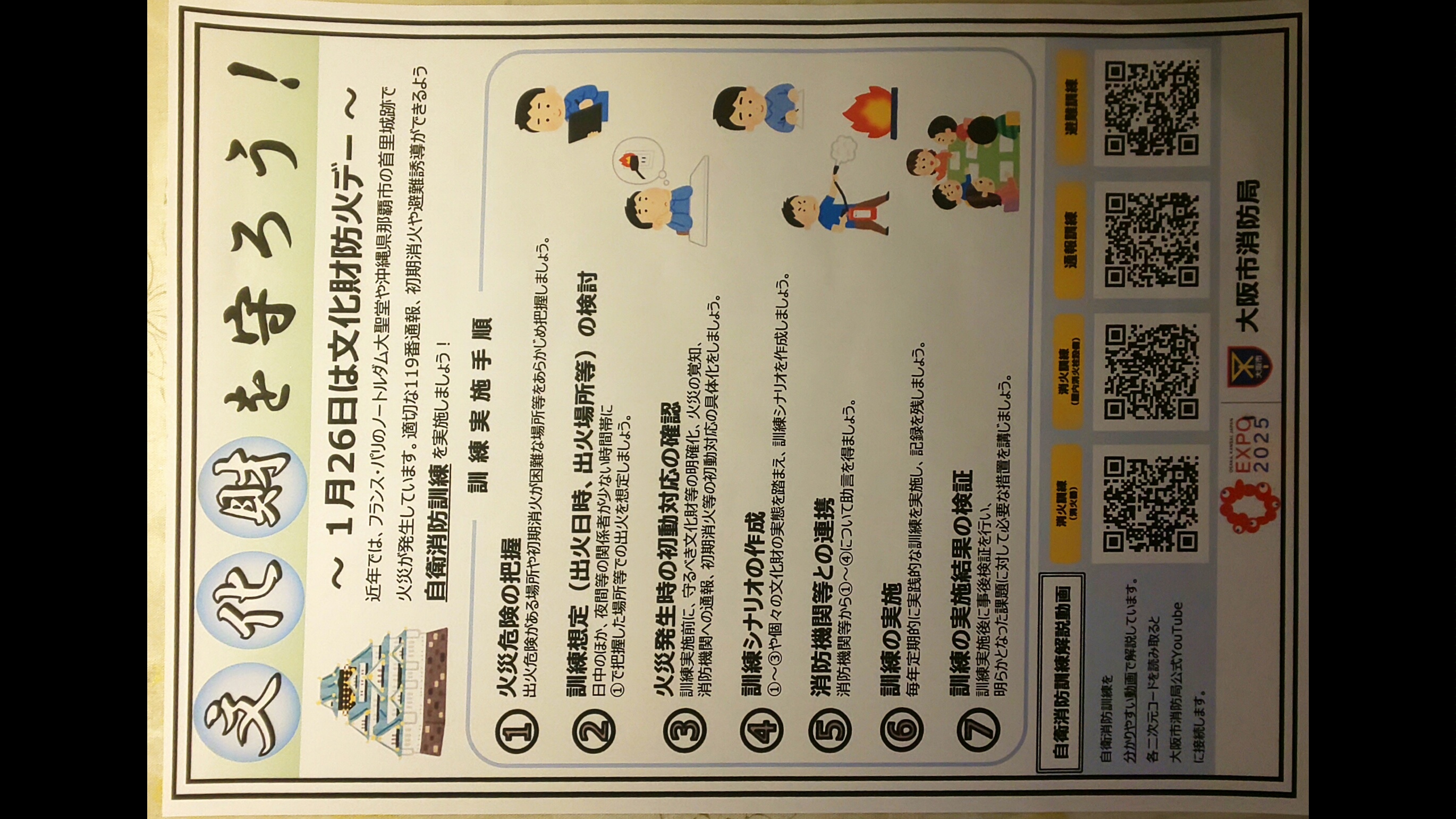 お知らせ 2021/01/26 文化財防火デー 本日、1月26日は文化財防火デーです。 72年前に世界最古の木造建造物の法隆寺金堂が炎上し、壁画が焼損したことに由来します。 圓満寺にも3点大阪市指定の文化財があります。詳しくはホームページの「宝物」を御覧ください。先人の方々が大切にし、今まで伝えて下さった文化財です。後世に伝えて行くべく、皆さんで守って参りましょう。 今の季節、空気が乾燥しています。火の取り扱いには十分に気をつけましょう。
